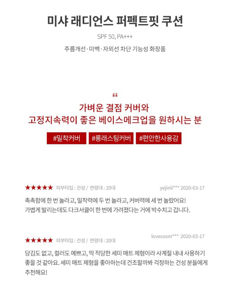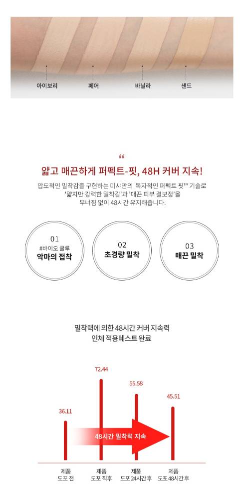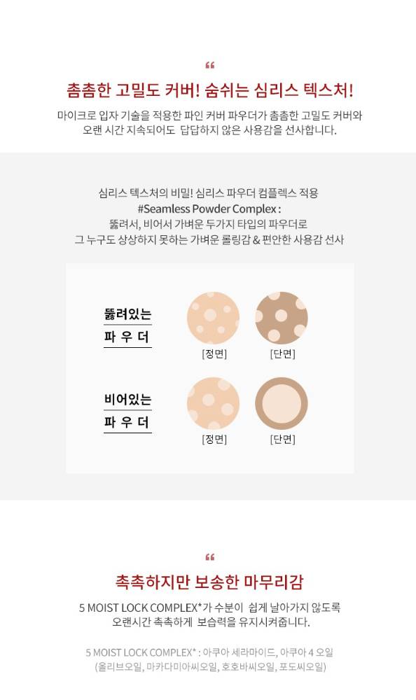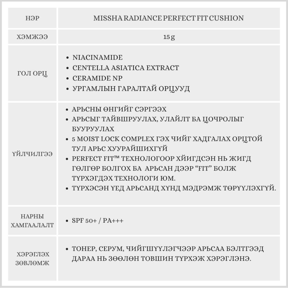 Perfect Fit™ технологоор хйигдсэн нь жигд гөлгөр болгох ба арьсан дээр “fit” болж түрхэгдэх технологи юм. “5 Moist Lock Complex” чийг хадгалах орцтой тул, матт байдалтай боловч арьс хуурайшихгүй байхаар бүтээгдсэн Cushion юм. Түрхэсэн үед арьсанд хүнд мэдрэмж төрүүлэхгүй.