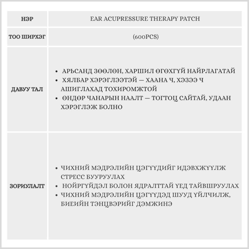 Чихний мэдрэлийн цэгүүдийг идэвхжүүлж, биеийн энергийн урсгалыг тэнцвэржүүлэх зориулалттай терапийн наалт юм. Биеийн ядаргаа, стрессийг багасгаж,тайвшруулах нөлөөтэй.