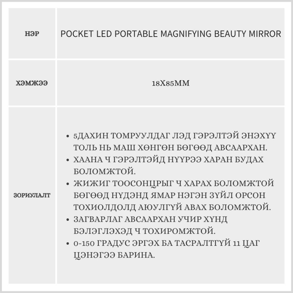 Маш хөнгөн бөгөөд авсаархан энэхүү толь нь 150' хүртэл эргэх бөгөөд 3өнгийн лэд гэрэлтэйгээс гадна 5дахин томруулна. Гэрэл нь 11цаг тасралтгүй ажиллана.Type C цэнэглэгчтэй учир хаана ч цэнэглэх боломжтой.