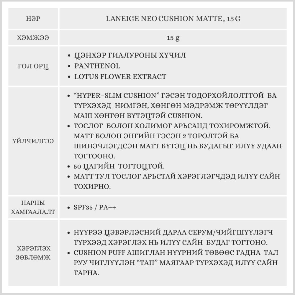 “Hyper–slim cushion” гэсэн тодорхойлолттой ба түрхэхэд нимгэн, хөнгөн мэдрэмж төрүүлдэг маш хөнгөн бүтэцтэй cushion. Тослог болон холимог арьсанд тохиромжтой. Матт болон энгийн гэсэн 2 төрөлтэй ба шинэчлэгдсэн матт бүтэц нь будагыг илүү удаан тогтооно.