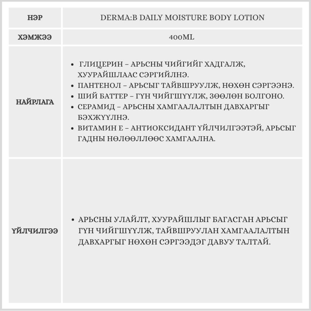 МЭДРЭМТГИЙ, УЛАЙЛТТАЙ, ХУУРАЙ АРЬСАНД ЗОРИУЛСАН ТАЙВШРУУЛАГЧ БИЕИЙН LOTION. АРЬСЫГ ТАЙВШРУУЛЖ, ГҮН ЧИЙГШҮҮЛЭН, ХАМГААЛАЛТЫН ДАВХАРГЫГ НӨХӨН СЭРГЭЭДЭГ.