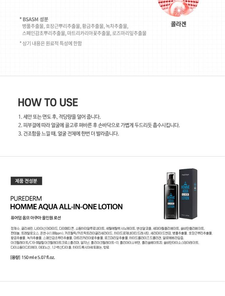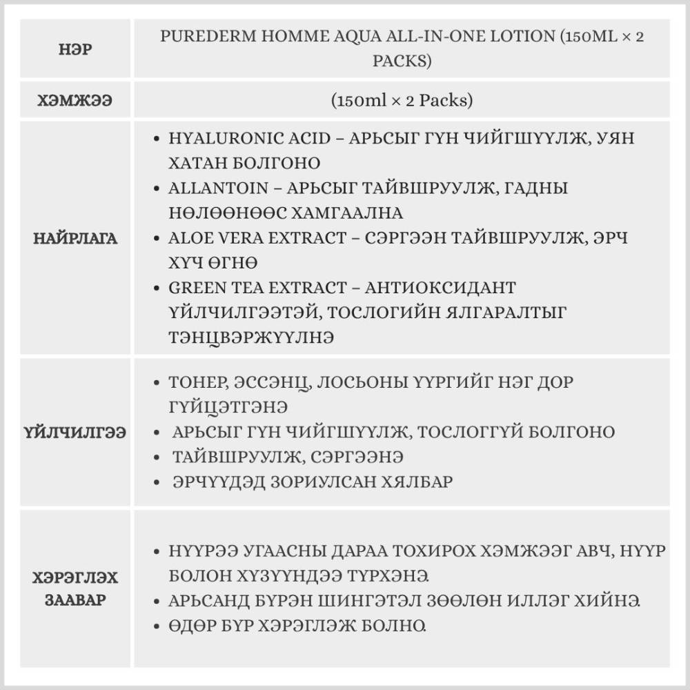 Purederm Homme Aqua All-in-One Lotion(Эрэгтэй нүүрний арьс арчилгаа)