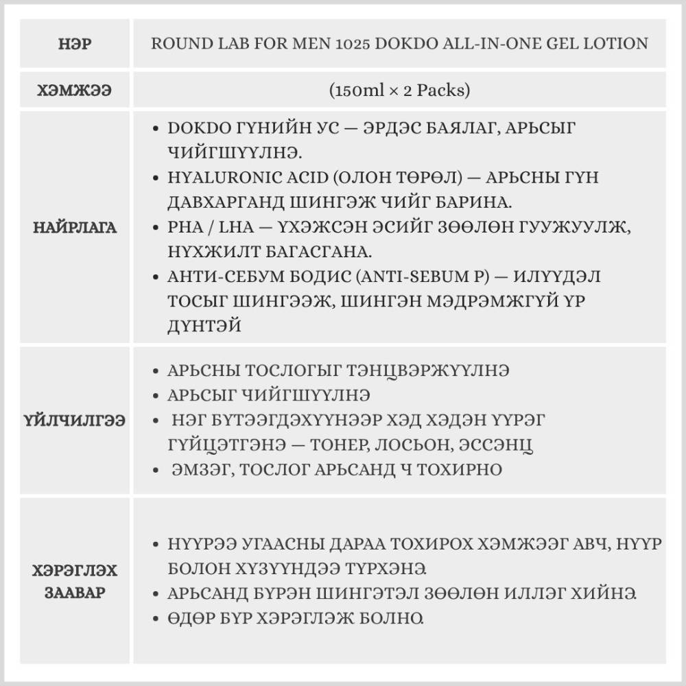 Round Lab For Men 1025 Dokdo All-in-One Gel Lotion(Эрэгтэй нүүрний арьс арчилгаа)