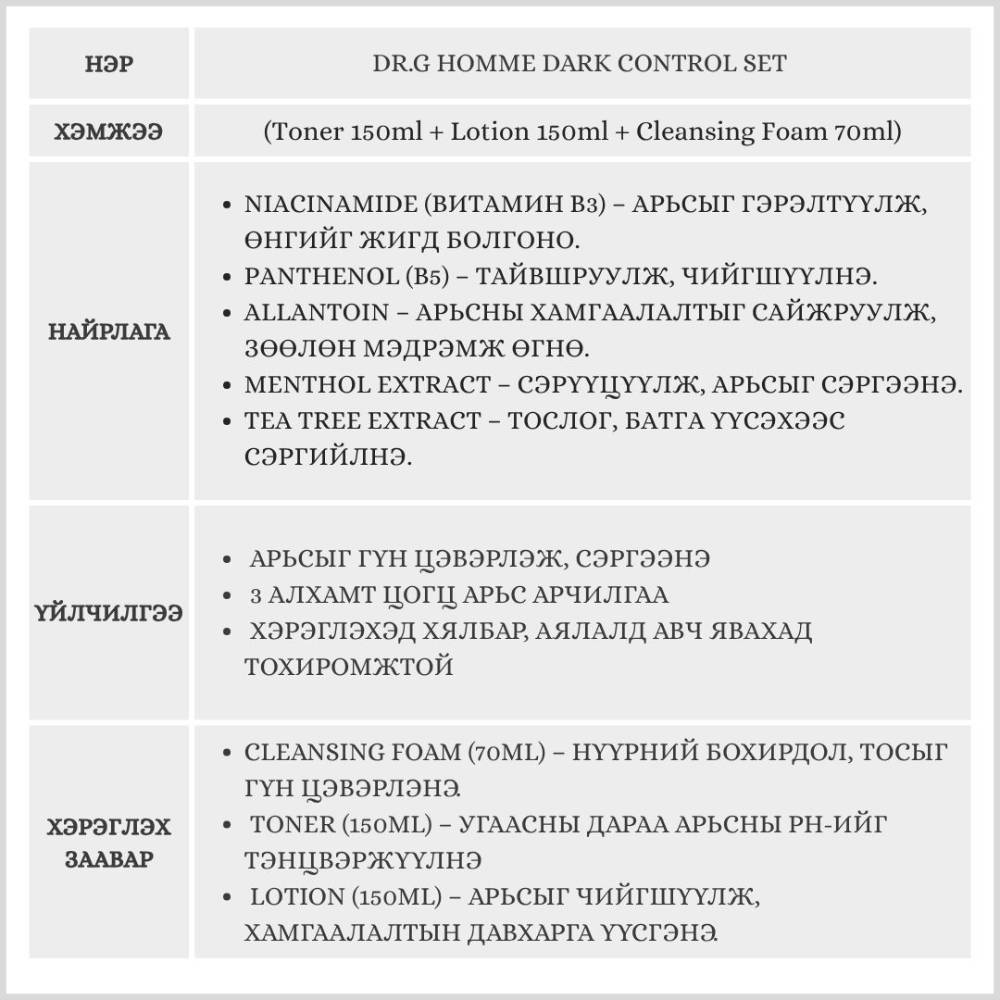 Dr.GDr.G Homme Dark Control Set Toner 150ml + Lotion 150ml + Cleansing Foam 70ml(Эрэгтэй нүүрний арьс арчилгаа)