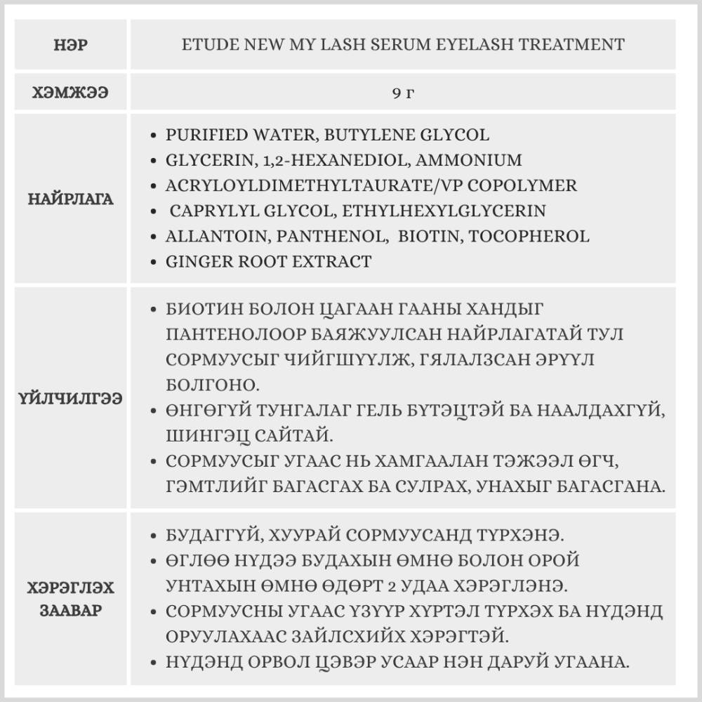 Сормуусыг угаас нь хамгаалан тэжээл өгч, гэмтлийг багасгах эмчилгээний серум. Өнгөгүй тунгалаг гель бүтэцтэй.