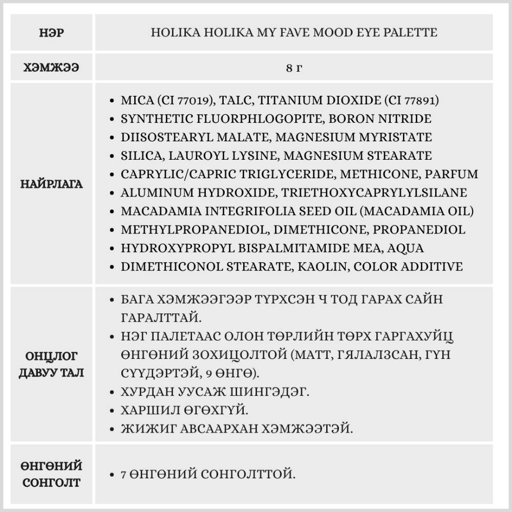 Нэг палеттаа 9 өнгөтэй, жигд, тод гаралттай нүдний тень.