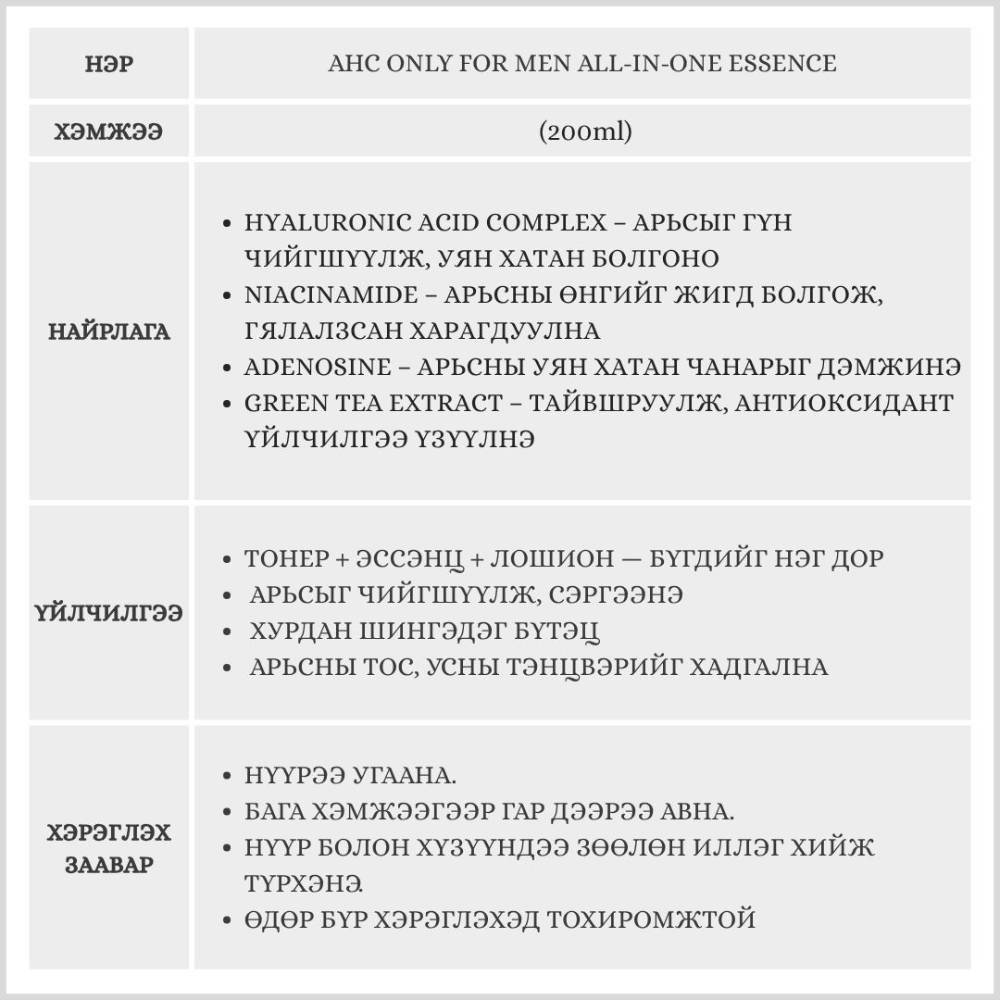 AHC Only for Men All-in-One Essence 200ml(Эрэгтэй нүүрний арьс арчилгаа)