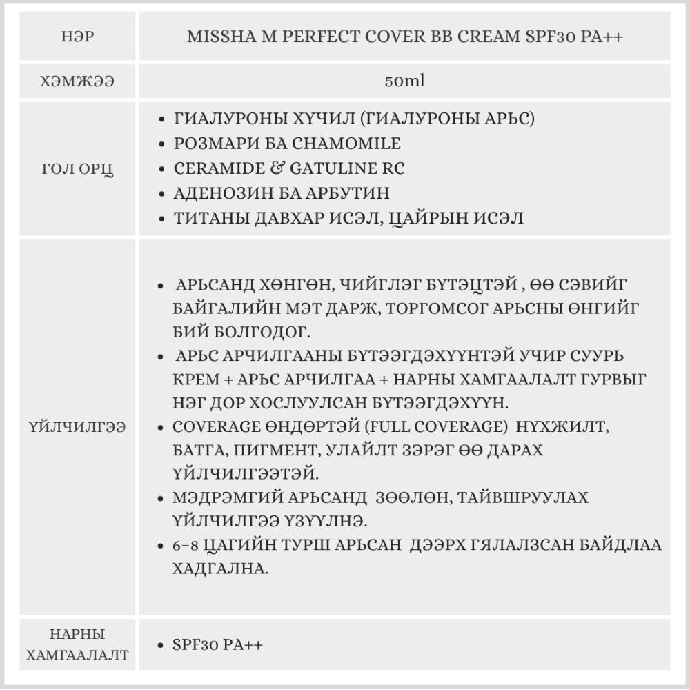 MISSHA-ийн хамгийн алдартай BB крем — дэлхий даяар 30 сая ширхэгээс дээш борлуулалттай. Арьсанд хөнгөн, чийглэг бүтэцтэй , өө сэвийг байгалийн мэт дарж, торгомсог арьсны өнгийг бий болгодог. Арьс арчилгааны бүтээгдэхүүнтэй учир суурь крем + арьс арчилгаа + нарны хамгаалалт гурвыг нэг дор хослуулсан.