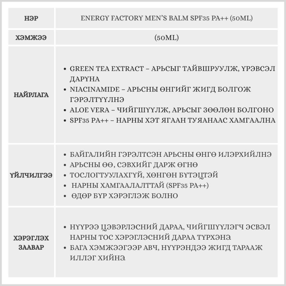 Energy Factory Men’s Balm SPF35 PA++ 50ml(Эрэгтэй нүүр будалт)