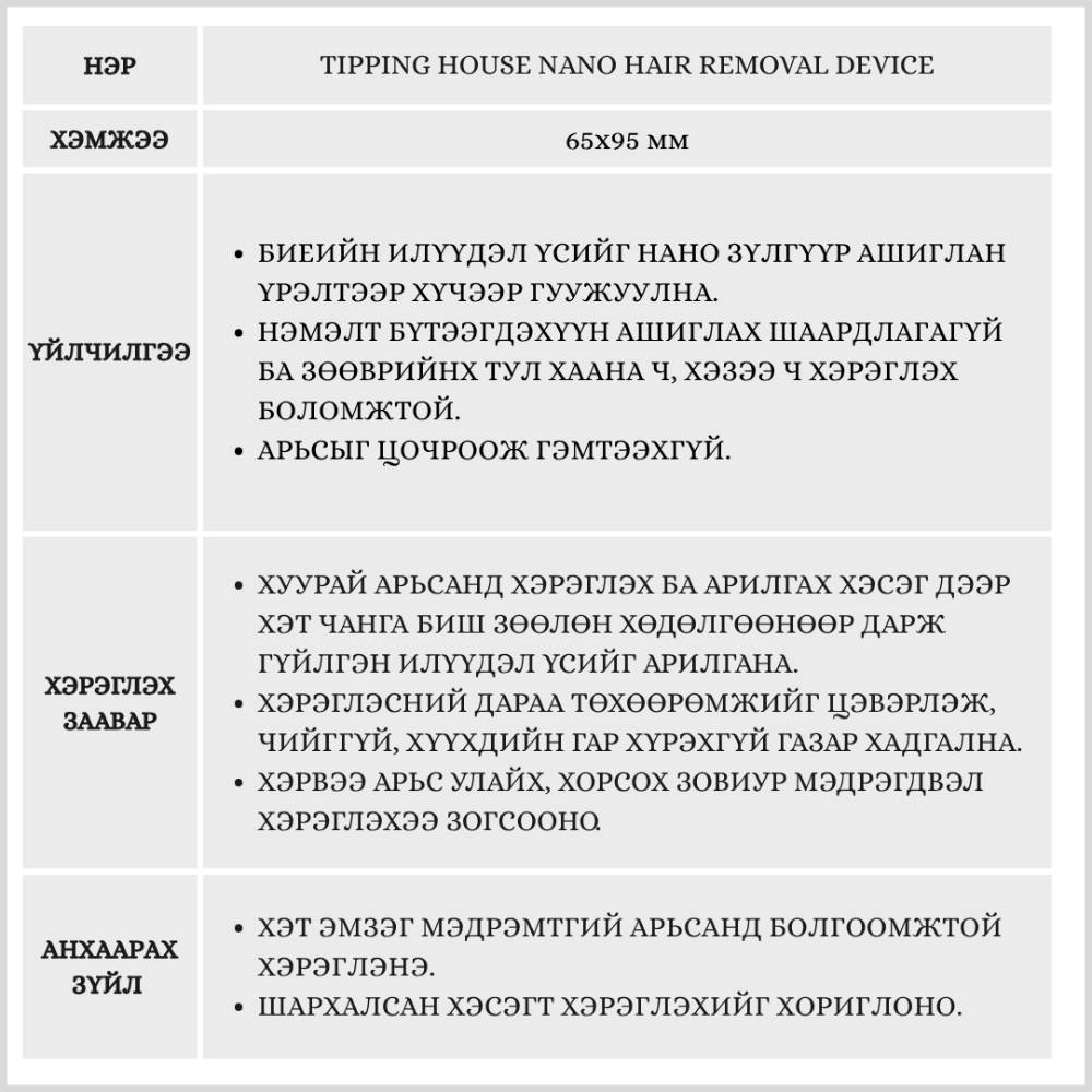 Биеийн илүүдэл үсийг үрэлтийн хүчээр арилгах нано зүлгүүр. Тос болон бусад нэмэлт бүтээгдэхүүн ашиглахгүй тул арьсыг цочроож, гэмтээхгүй.