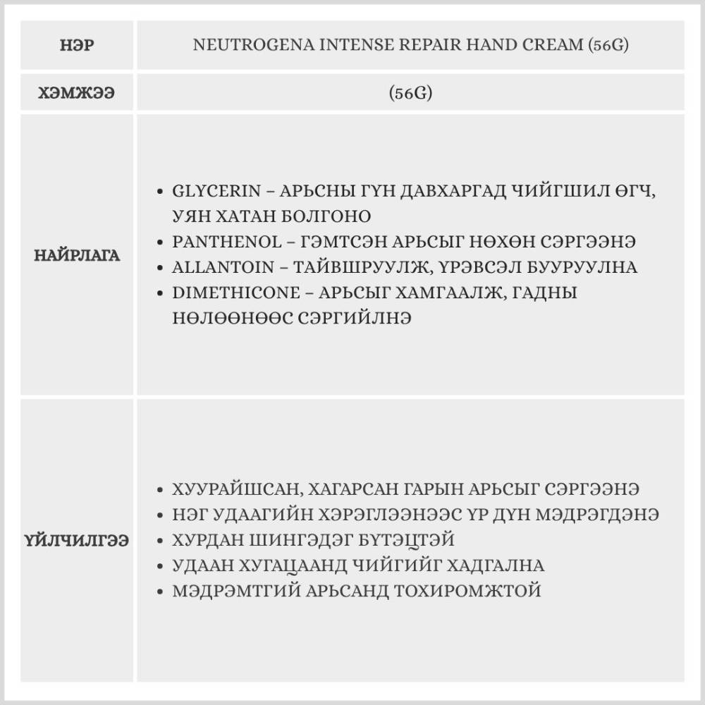 Хуурайшсан, гэмтсэн гарын арьсыг гүн чийгшүүлж, сэргээдэг өндөр концентрацитай гарын тос юм. Норвегийн формул-ийн тусламжтайгаар арьсны гүн давхаргад хүртэл чийгшлийг өгнө.