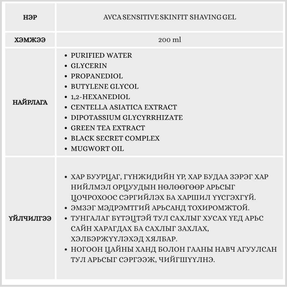 Тунгалаг бүтэцтэй сахлын гель. Эмзэг мэдрэмтгий арьсанд тохиромжтой. Арьсыг цочроож харшил өгөхгүй.