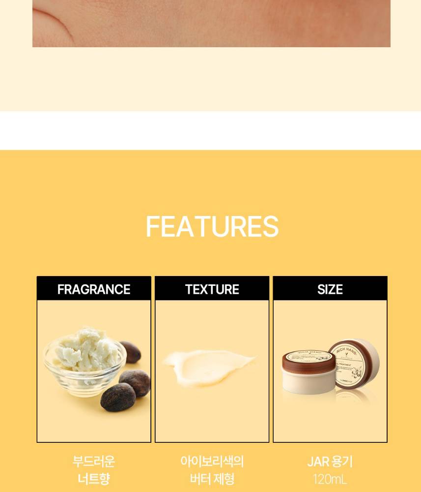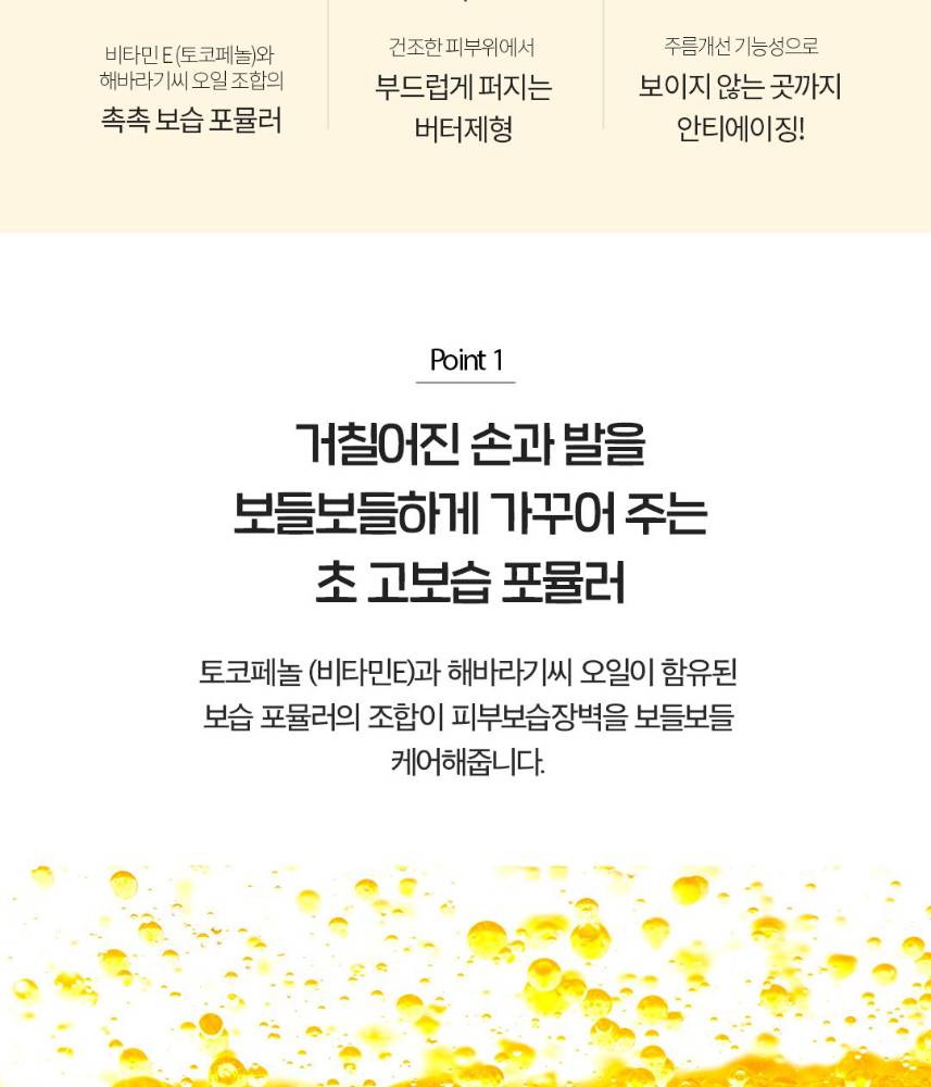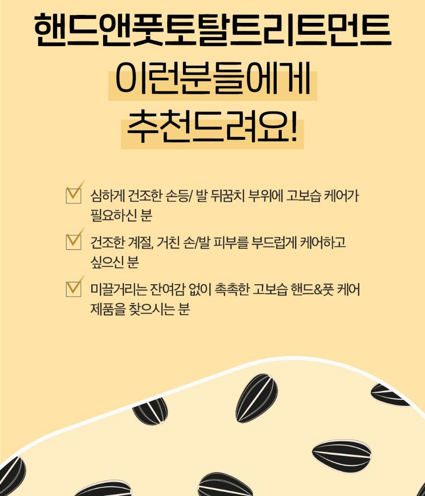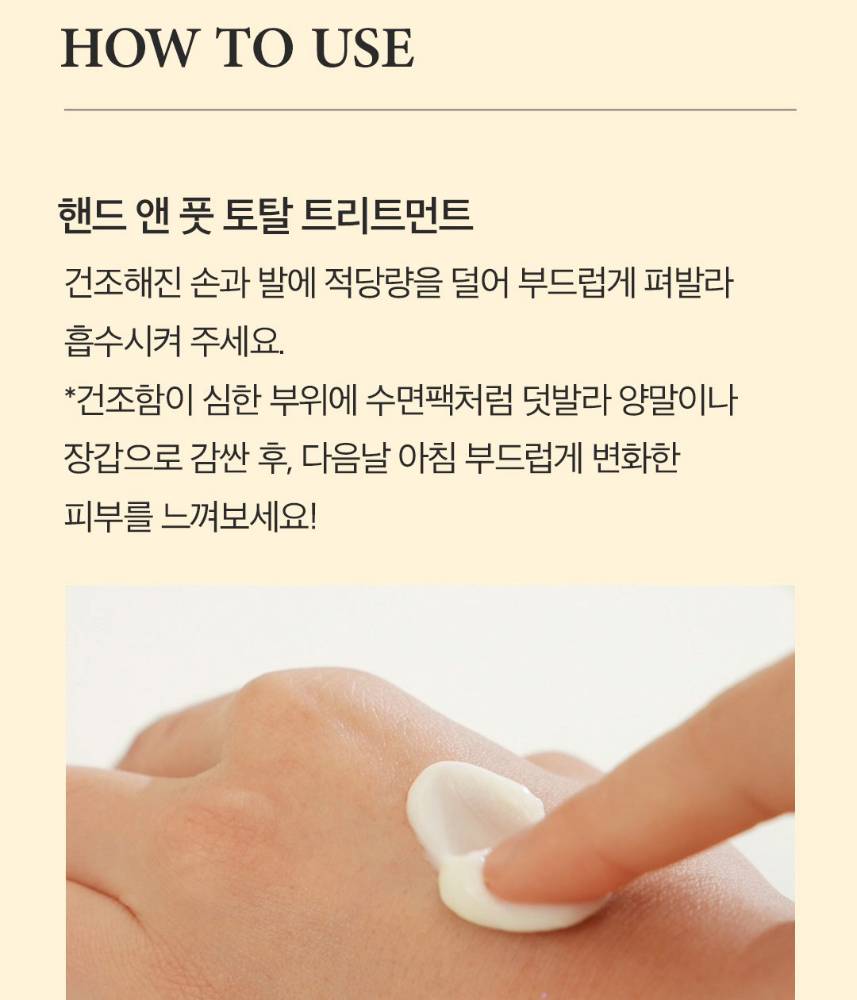 Гар ба хөлийн хуурай, ширүүн арьсыг тэжээлээр хангаж, гүн чийгшүүлэх зориулалттай тос юм. Shea butter, коллаген, витамин Е зэрэг найрлага нь арьсыг зөөлрүүлж, уян хатан болгож, гар болон хөлийг толигор, эрүүл болгоно.