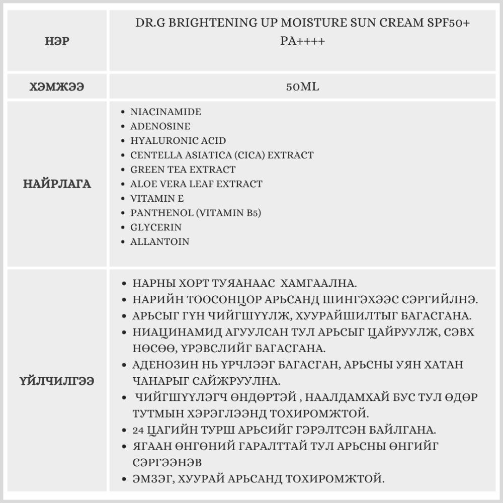 "DR.G BRIGHTENING UP MOISTURE SUN CREAM SPF50+ PA++++