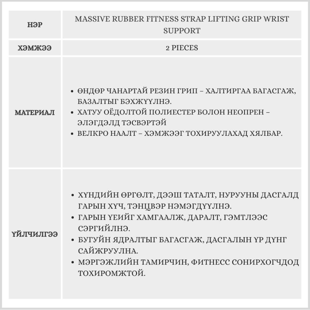 ХҮНДИЙН ӨРГӨЛТ, ФИТНЕСС ДАСГАЛД ЗОРИУЛСАН ГАРЫН ҮЕНИЙ ХАМГААЛАГЧ БА БАРЬЦ САЙЖРУУЛАГЧ СТРЭП ЮМ. РЕЗИНЭН ГРИПТЭЙ ТУЛ ХАЛТИРГААГҮЙ, ТОГТВОРТОЙ БАРЬЦ ҮҮСГЭНЭ. ӨНДӨР ЧАНАРТАЙ МАТЕРИАЛААР ХИЙСЭН ТУЛ УРТ ХУГАЦААНДАА УРАГДАХГҮЙ, ХӨДӨЛГӨӨНИЙ УЯН ЧАНАРЫГ ХАДГАЛНА.