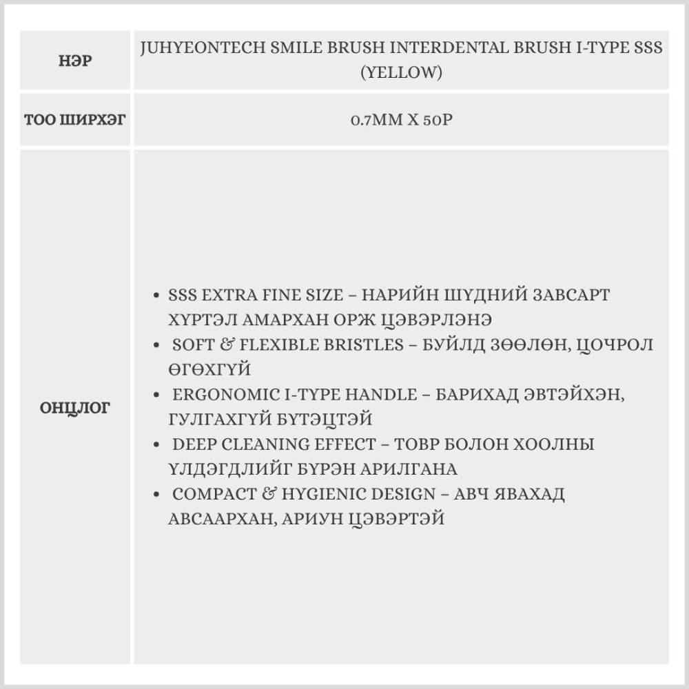 Шүдний завсрыг гүн цэвэрлэх зориулалттай нарийн хэмжээний (SSS) шүдний завсрын сойз юм. Энэ бүтээгдэхүүн нь хоолны үлдэгдэл, өнгөрийг үр дүнтэй арилгаж, амны хөндийн цэвэр байдлыг хадгалахад тусална.