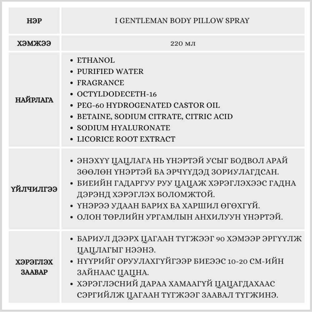 Олон төрлийн ургамлын анхилуун үнэртэй эрчүүдэд зориулсан биеийн мист. Мөн дэрэнд үнэр оруулахад хэрэглэх боломжтой ба харшил өгөхгүй.