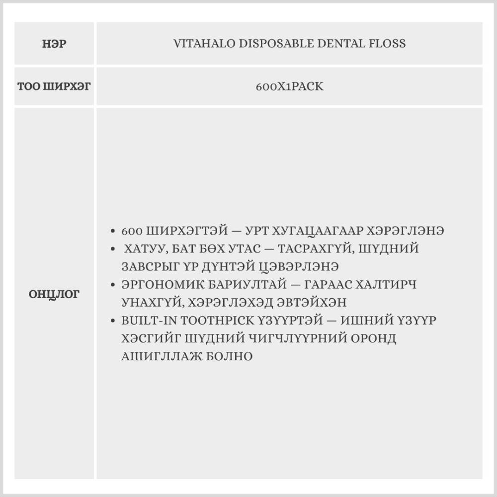 600 ширхэгтэй нэг удаагийн шүдний утас бөгөөд, шүдний завсар дахь бохирдол, хоолны үлдэгдэл, өнгөрийг цэвэрхэн арилгах зориулалттай. Хэрэглэхэд хялбар бариултай тул аялал, оффис, өдөр тутмдаа хэрэглэж болно
