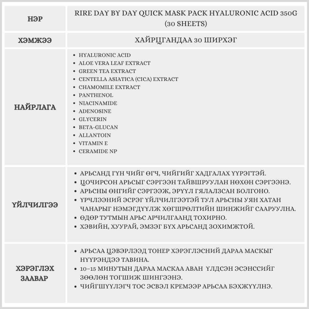 RIRE DAY BY DAY QUICK MASK PACK HYALURONIC ACID 350G (30 SHEETS)