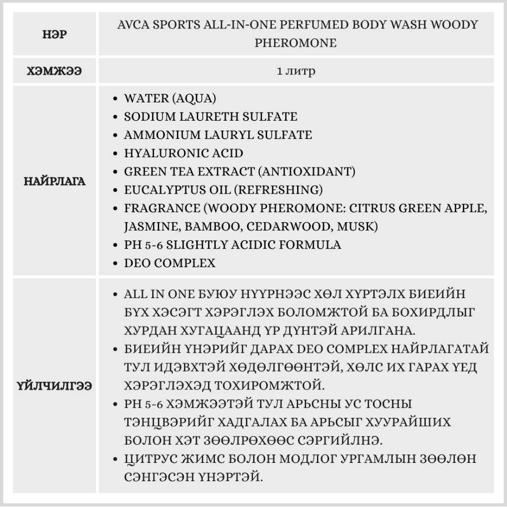AVCA Sports All‑in‑One Perfumed Body Wash Woody Pheromone , 1L
