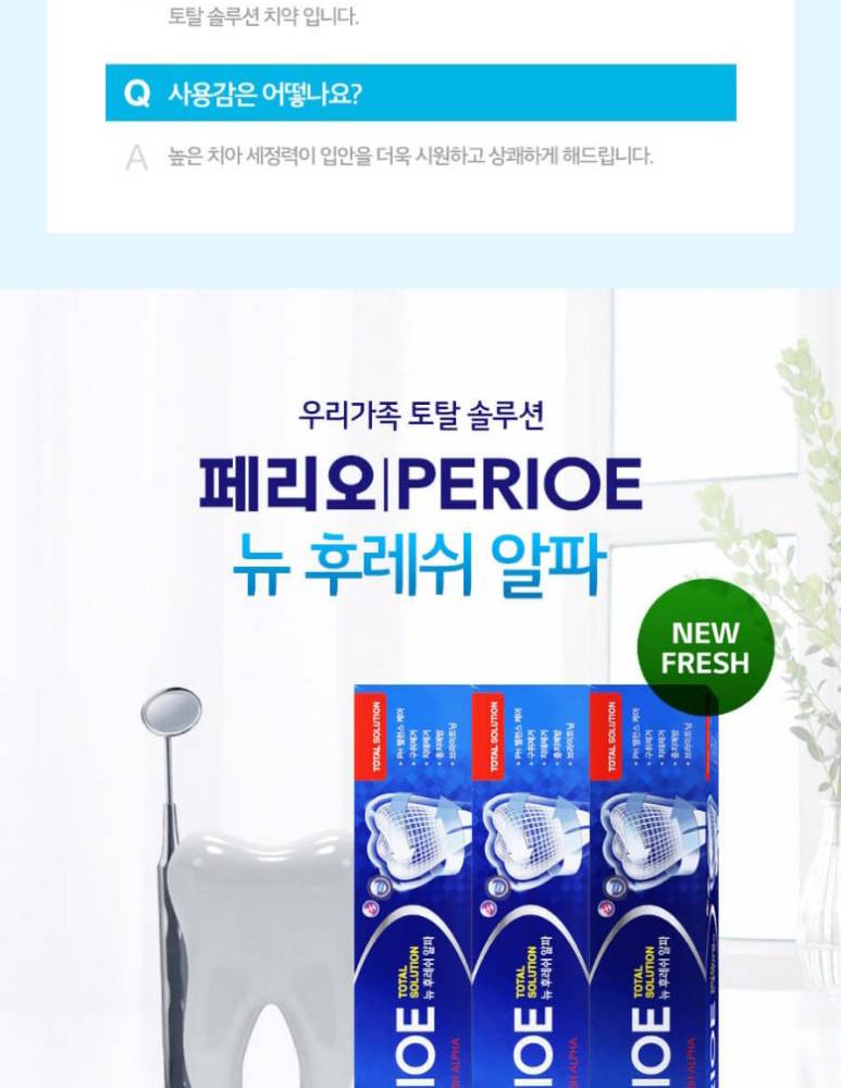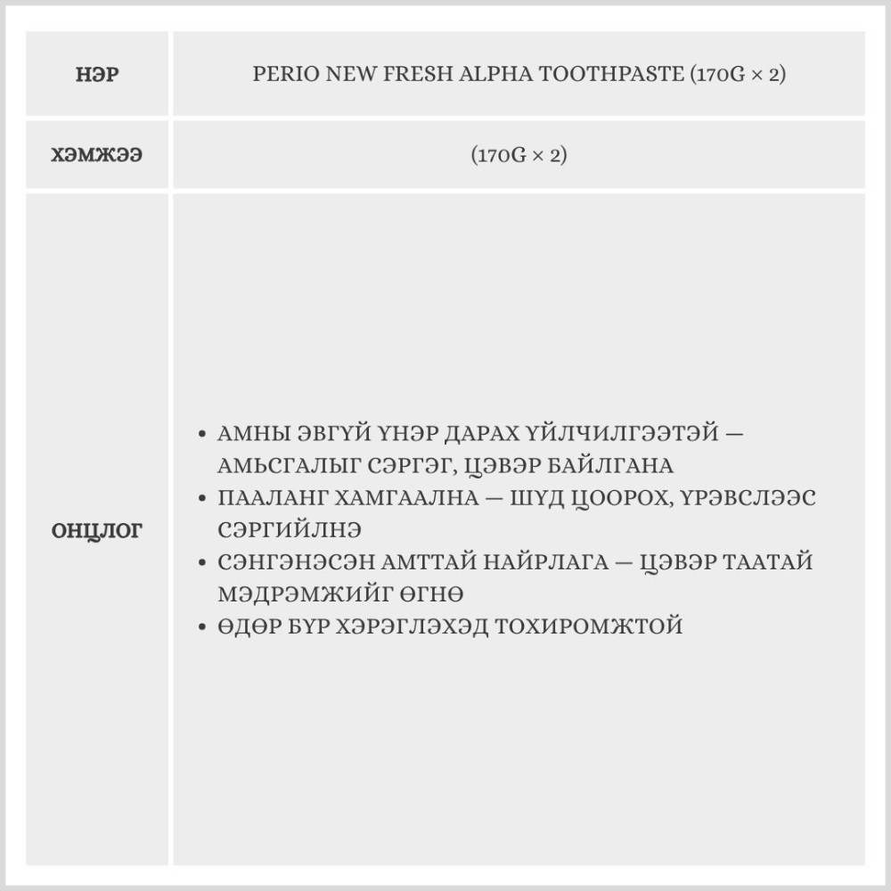 Амны хөндийг цэвэрлэж, шүдийг хамгаалах шүдний оо юм. Perio брэндийн энэхүү оо нь шүдний пааланг хамгаалж, удаан үргэлжлэх сэнгэнэсэн мэдрэмж өгдөгөөрөө онцлог.