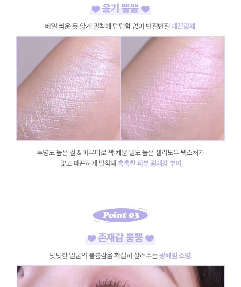 Арьсанд гэрэлтэл өгдөг ба нүүрний хэлбэрийг тодруулж,гялалзсан эффект бий болгодог. Энэ хайлайтер нь jelly-dough бүтэцтэй, арьсан дээр нимгэн давхарга үүсгэн, нарийн ширхэгт перл-гялтгануур гэрэлтэлтэй болгодог.Хөнгөн бүтэцтэй учир хатаж хуурайшдаггүй.