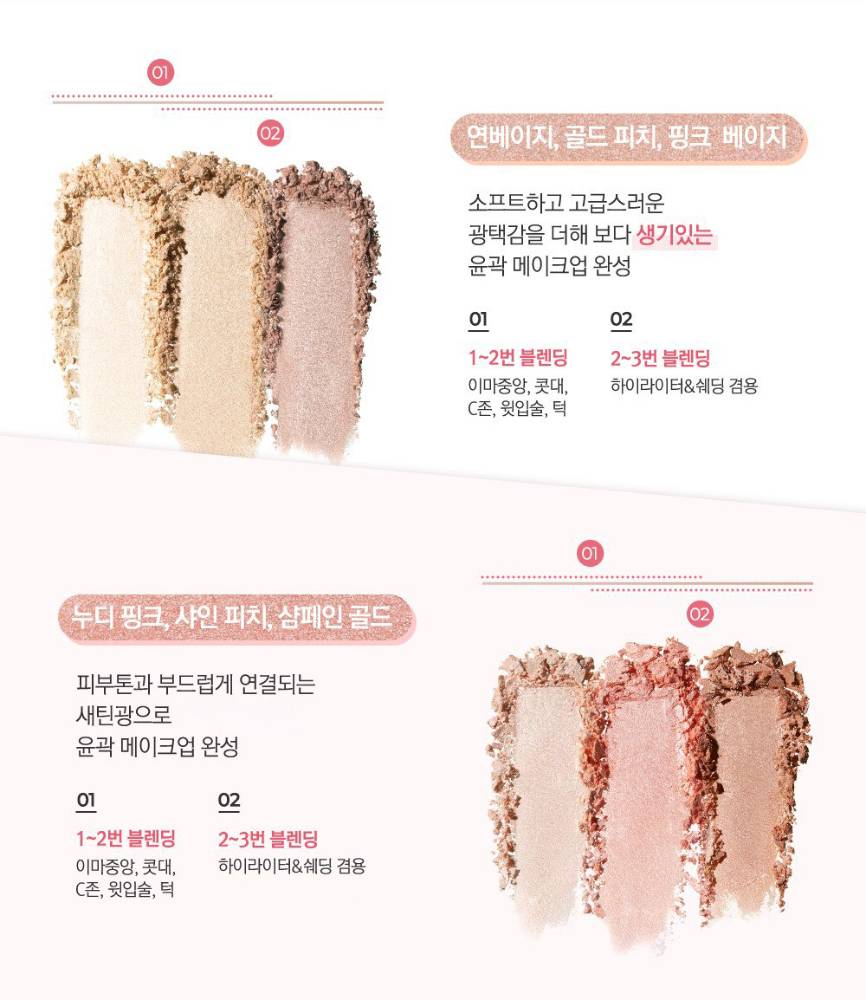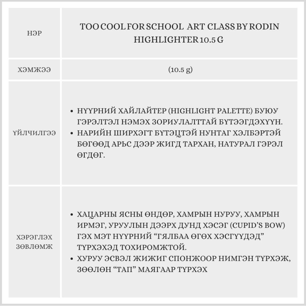 Нүүрний хайлайтер (highlight palette) буюу гэрэлтэл нэмэх зориулалттай бүтээгдэхүүн. Нарийн ширхэгт бүтэцтэй нунтаг хэлбэртэй бөгөөд арьс дээр жигд тархан, натурал гэрэл өгдөг.