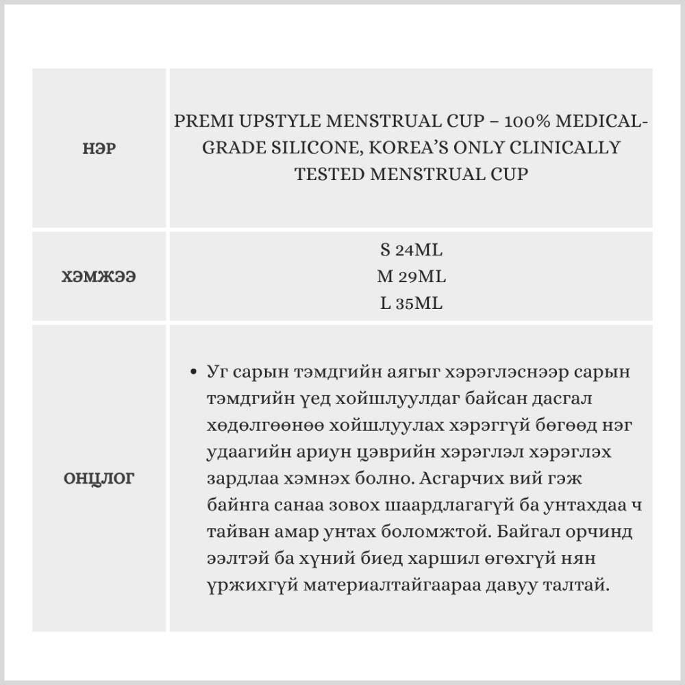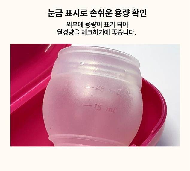 Уг сарын тэмдгийн аяга нь 3 төрөл байгаа ба S размерыг сарын тэмдэг бага ирдэг болон үтрээний урт нь богино хүмүүс, M размерыг сарын тэмдэг нь хэвийн ирдэг ба үтрээний урт богино биш хүмүүс. L размерыг сарын тэмдэг их ирдэг болон үтрээний урт богино биш хүмүүс хэрэглэнэ.
