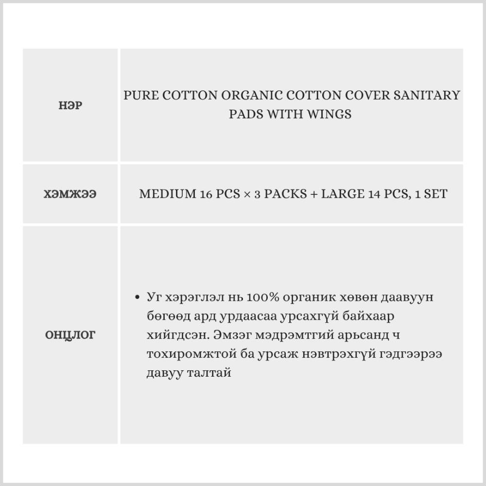 Pure Cotton Organic Cotton Cover Sanitary Pads with Wings Medium 16 pcs × 3 packs + Large 14 pcs, 1 set /Ариун цэврийн хэрэглэл/