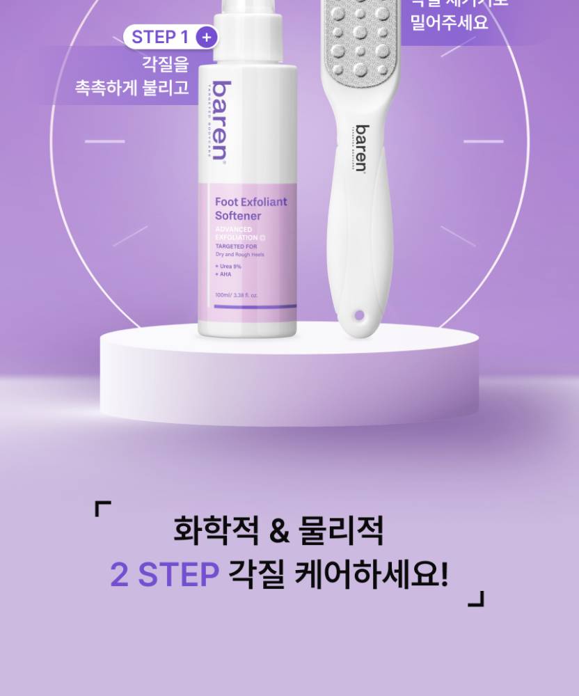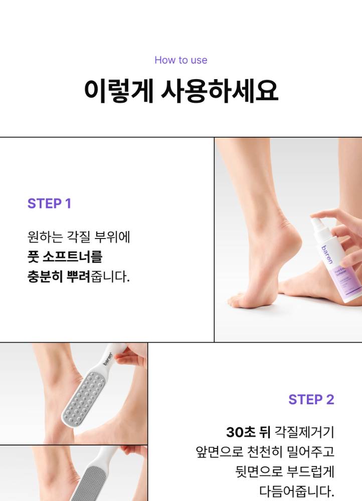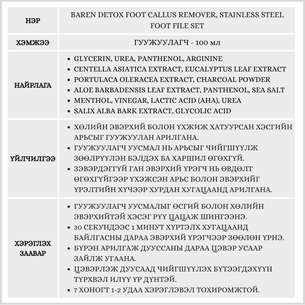 Хөлийн эвэрхийг үр дүнтэй арилгах гуужуулагч уусмал болон зэвэрдэггүй ган үрэгч бүхий хоёр алхамт сет бүтээгдэхүүн. Зөвхөн өсгий, эвэрхий болон хөлийн үхжиж хатуурсан арьстай хэсэгт л хэрэглэнэ.