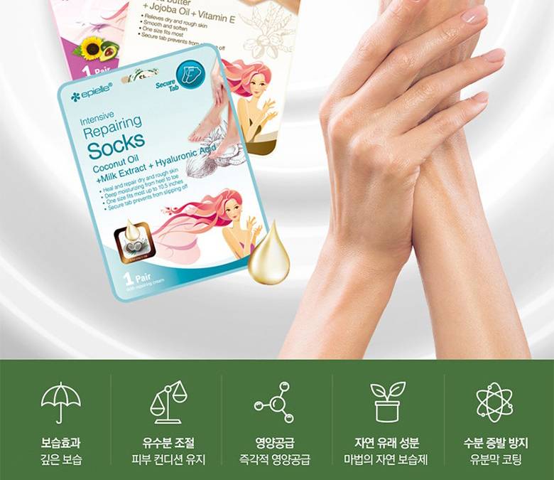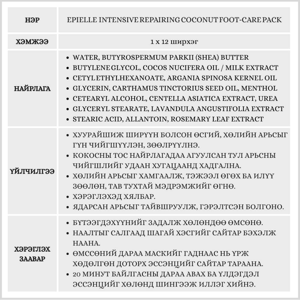 Хөлийн арьсыг тайвшруулан чийгшүүлэх үйлчилгээтэй хөлийн маск. Найрлагадаа кокосны тос агуулсан тул хөлийн арьсанд тэжээл өгч зөөлөн толигор болгоно.