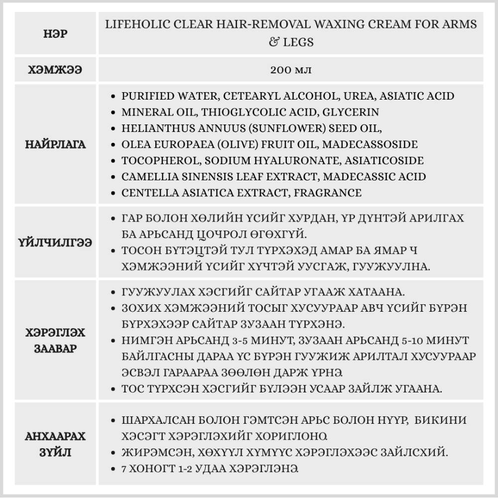Хөл болон гарын илүүдэл үс гуужуулагч тос. Арьсанд цочрол өгөхгүй ба илүүдэл үсийг хурдан хугацаанд үр дүнтэй гуужуулна.