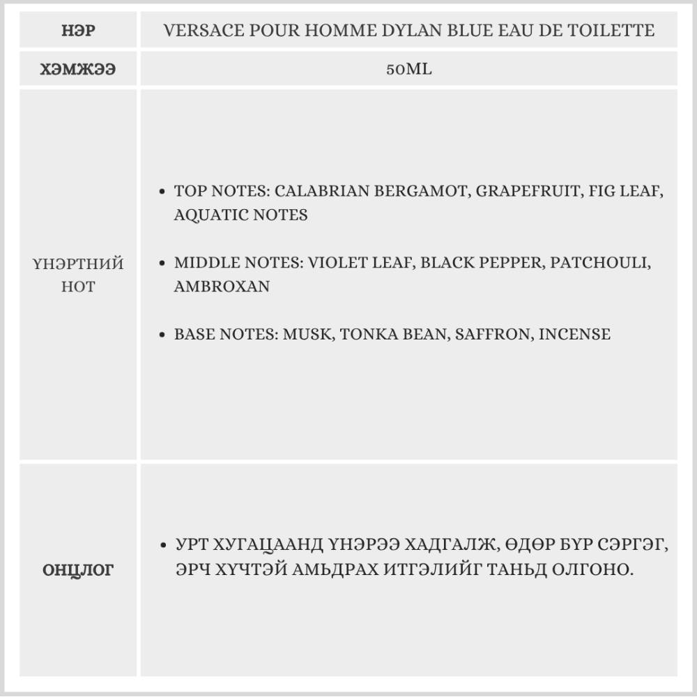 ОРЧИН ҮЕИЙН ЭРЧҮҮДИЙН ҮНЭРИЙГ ИЛТГЭХ СЭРГЭГ БА ДУЛААН МЭДРЭМЖИЙГ ӨГДӨГ VERSACE БРЭНДИЙН ЭНЭХҮҮ ҮНЭРТЭЙ УС НЬ " CITRUS, WOODY, MUSKY" ҮНЭРЭЭРЭЭ БҮХЭЛ ӨДРИЙН ТУРШ ТАНИЙГ ӨӨРТӨӨ ИТГЭЛТЭЙ ТӨГС ТӨГӨЛДӨР БАЙХАД ТАНЬ ТУСЛАХ БОЛНО.