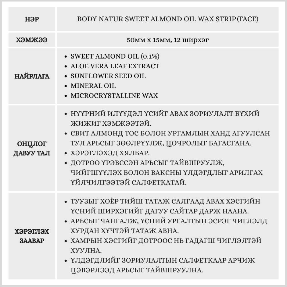 Body Natur брэндийн нүүрний илүүдэл үс авагч туузан вакс. Арьсыг тайвшруулах үйлчилгээтэй тул өвдөлт болон цочрол багатай.
