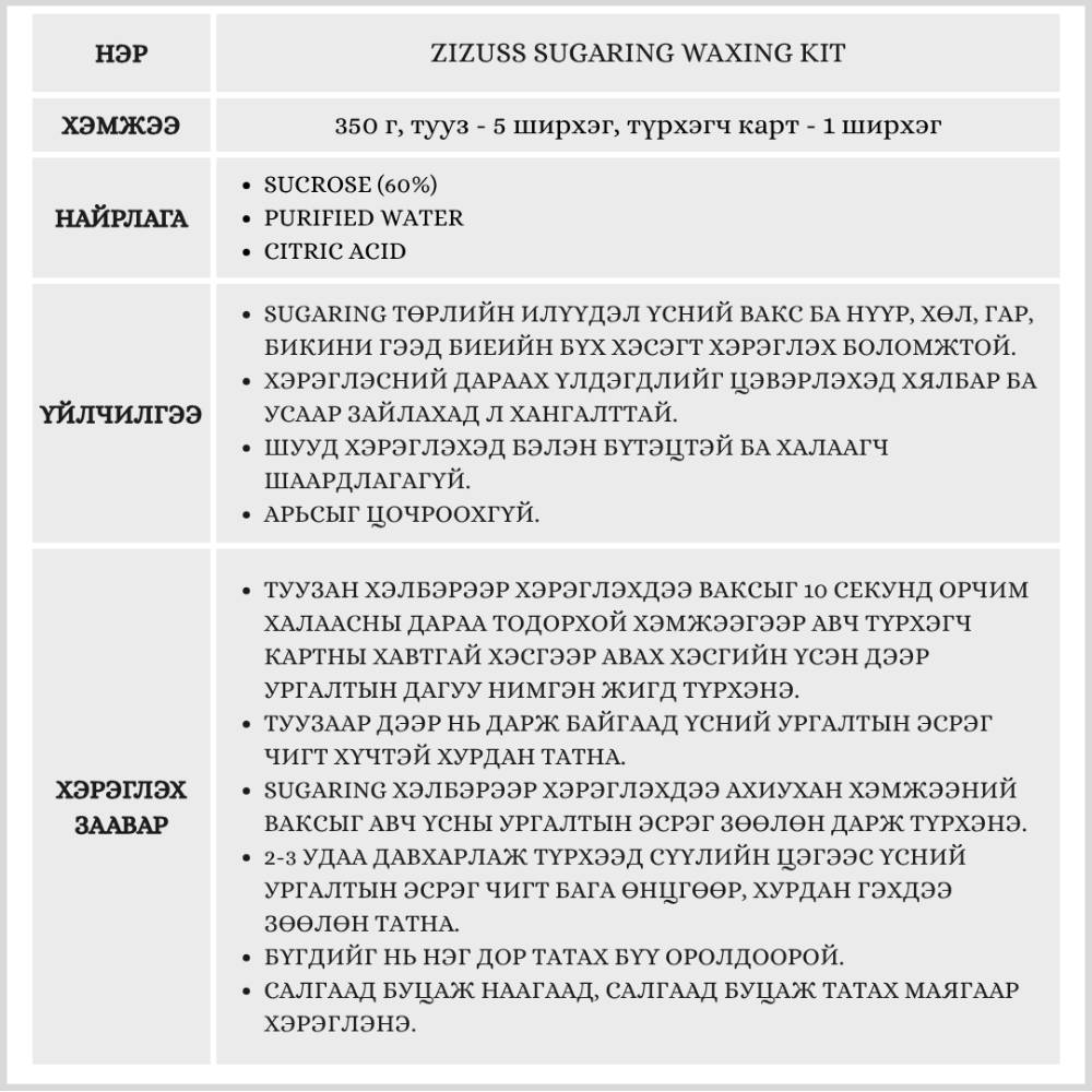 Нүүр, гар, хөл, бикини гээд биеийн бүх хэсэгт хэрэглэх боломжтой sugaring вакс. Натурал бүтээгдэхүүн бөгөөд арьсыг цочроохгүй ба хэрэглэхэд мөн цэвэрлэхэд хялбар.