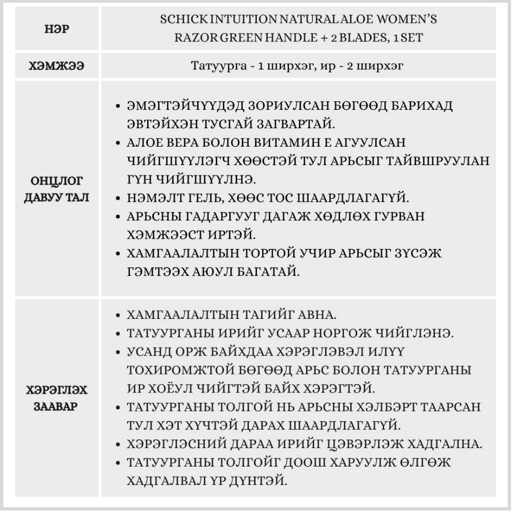 Эмэгтэйчүүдэд зориулсан илүүдэл үсний татуурга. Дотроо алое вера ханд агуулсан чийгшүүлэгч хөөстэй тул нэмэлт бүтээгдэхүүн шаардлагагүй.