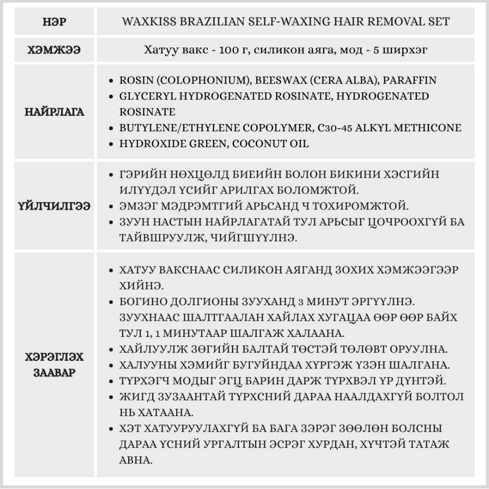 Гэрийн нөхцөлд бие болон бикини хэсгийн илүүдэл үсийг авах боломжтой хатуу бразил вакс сет. Зуун настын ханд агуулсан тул арьсыг цочроохгүй, харшил өгөхгүй.