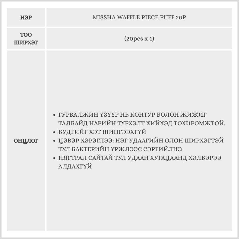 Будгийг түрхэхэд зориулагдсан вафль шиг олон нүхтэй (уян) бүтэцтэй спонж юм. Энэхүү онцгой бүтэц нь будгийг хэт шингээхгүйгээр арьсанд нимгэн, жигд түрхэх боломжийг олгоно.