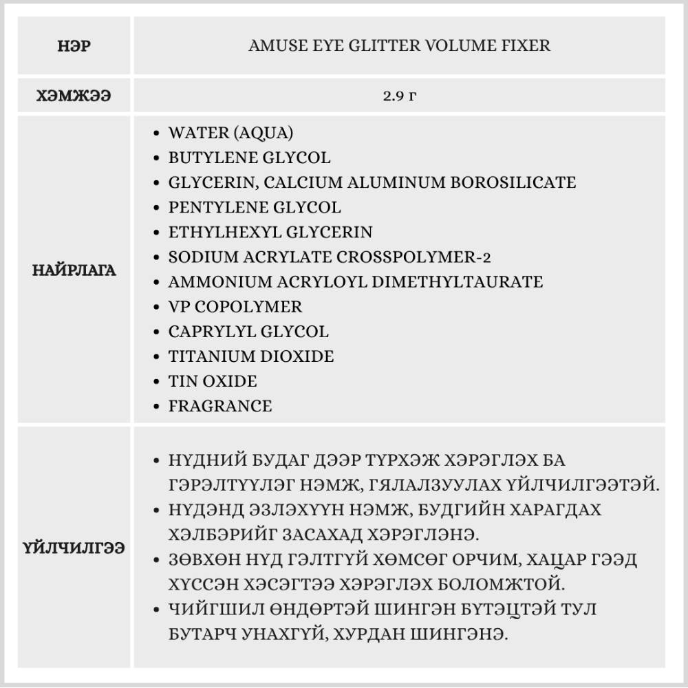 AMUSE брэндийн глиттер, шимер эффекттэй нүдний Volume fixer түрхдэг саа /2ширхэг/. Нүд гэлтгүй, хөмсөг орчим, хацар, хамар гээд хүссэн хэсэгтээ хэрэглэх боломжтой ба будгийг гялалзуулж, тодруулна.