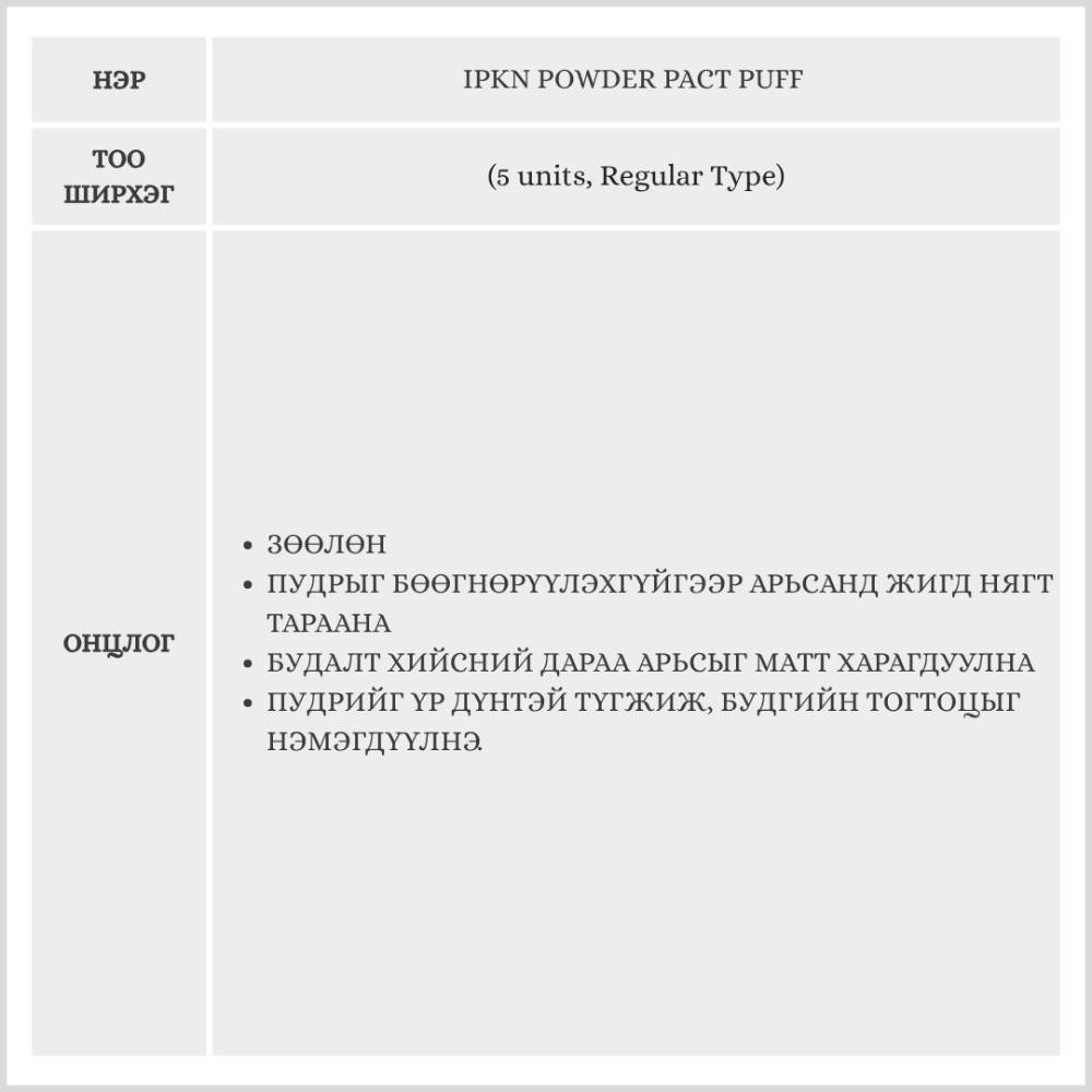 Powder болон pact бүтээгдэхүүнд зориулагдсан ердийн (regular) төрлийн пуфф юм. Зөөлөн, жигд нягтралтай бүтэц нь нунтаг будгийг арьсанд бөөгнөрүүлэхгүйгээр нимгэн, цэвэрхэн түрхэхэд тусална.