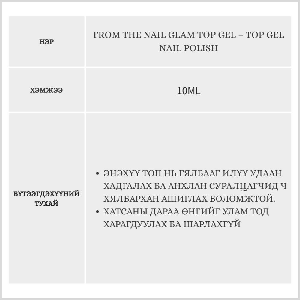 Энэхүү топ нь гялбааг илүү удаан хадгалах ба анхлан суралцагчид ч хялбархан ашиглах боломжтой. Хатсаны дараа өнгийг улам тод харагдуулах ба шарлахгүй.