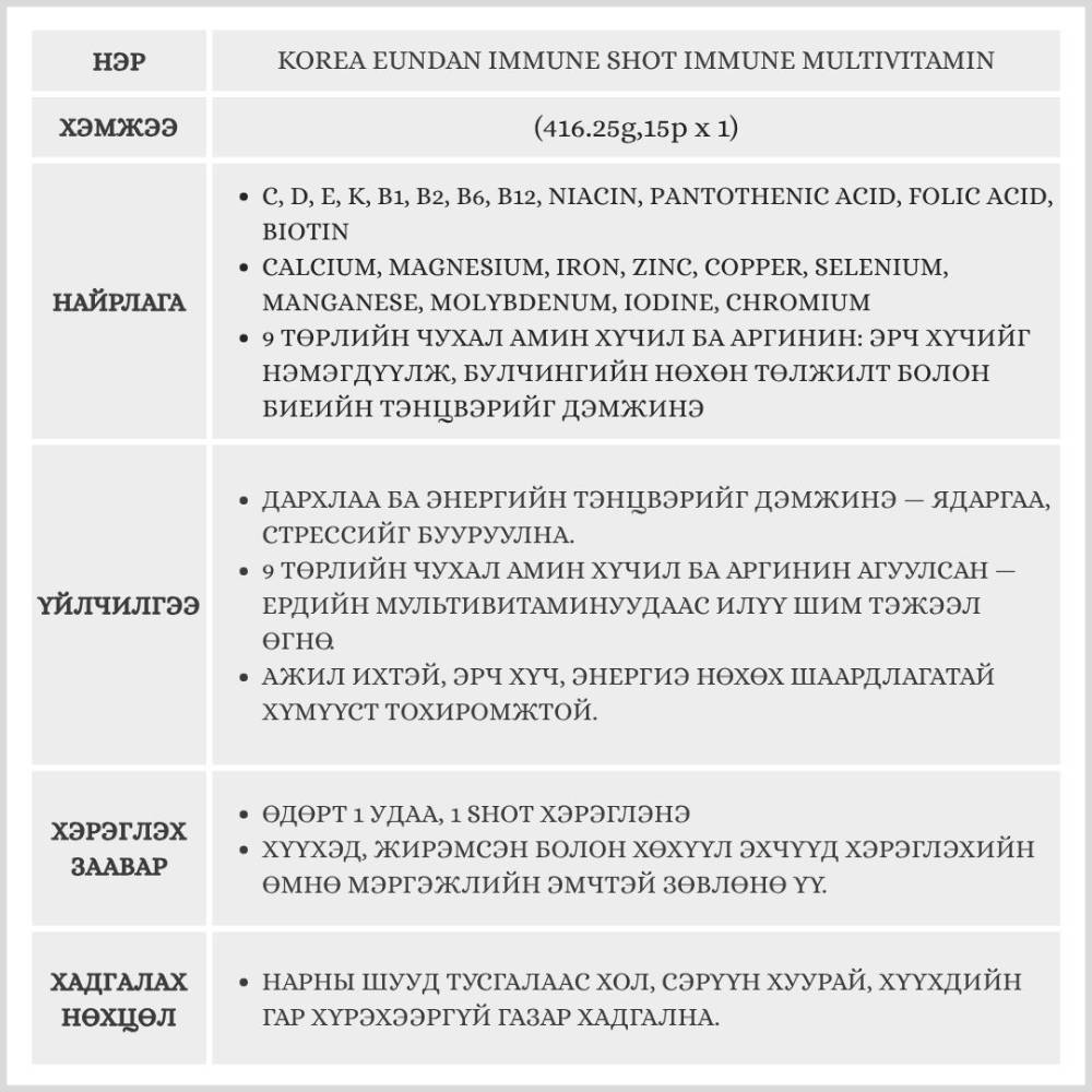 Дархлаа дэмжих, ядаргаа тайлах, эрч хүч нэмэх зориулалттай шингэн хэлбэрийн мультивитамин юм. Нэг удаагийн уух порцоор 13 төрлийн витамин болон 9 төрлийн эрдэс, нэмэлт дархлаа дэмжих найрлагуудыг агуулсан.