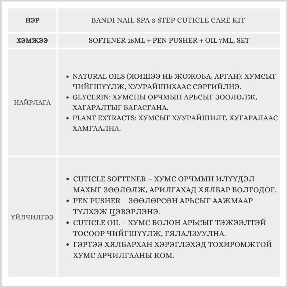 BANDI NAIL SPA 3 STEP CUTICLE CARE KIT – SOFTENER 15ML + PEN PUSHER + OIL 7ML SET, 1 PIECE