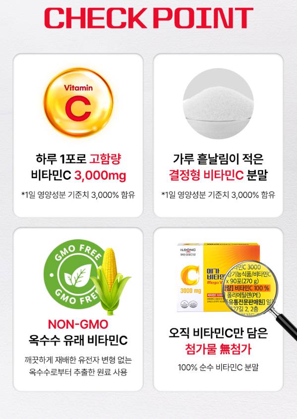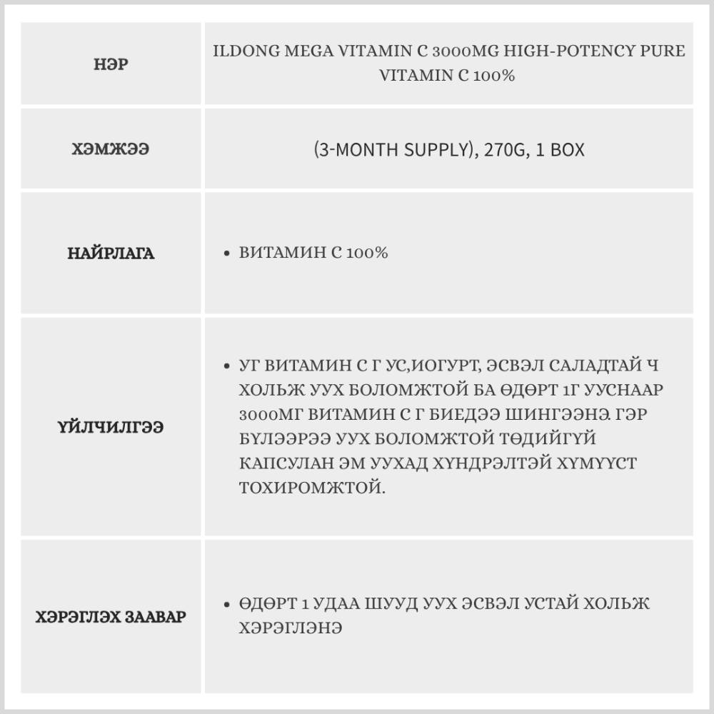 Уг витамин нь 1ширхэгтээ 3000мг витамин C агуулсан ба нунтаг хэлбэртэй тул уухад хялбар. Уг витамин C г эрдэнэ шишээс гаргаж авсан бөгөөд жирэмсэн болон хүүхэд ч хэрэглэх боломжтой витамин юм