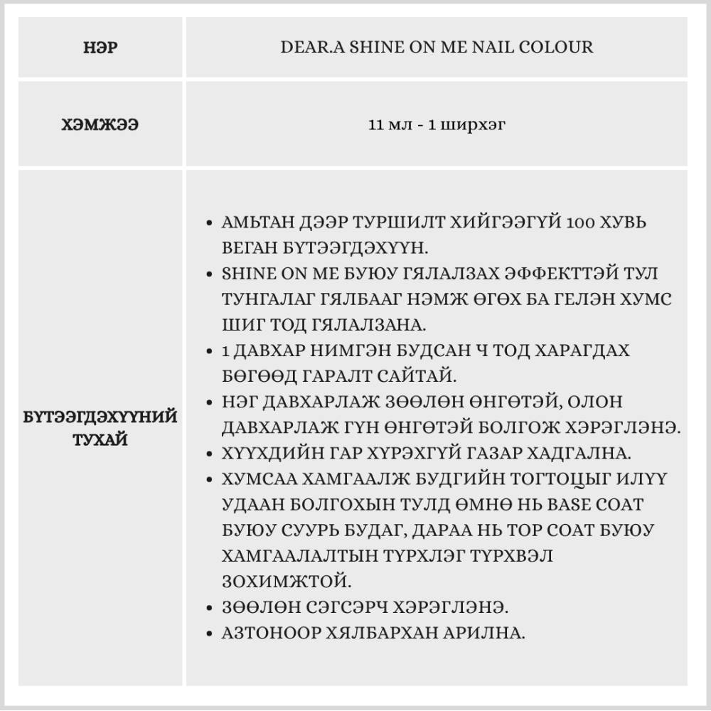 Амьтан дээр туршилт хийгээгүй 100 хувь веган хумсны будаг. Shine On Me буюу гялалзсан эффекттэй ба тод гаралттай.