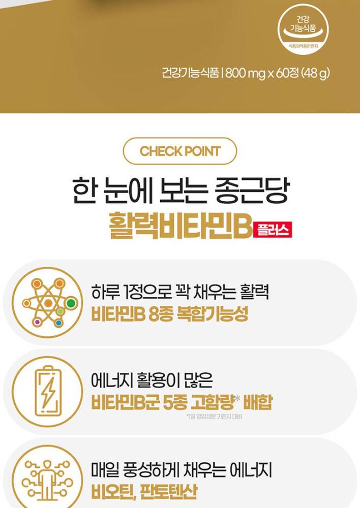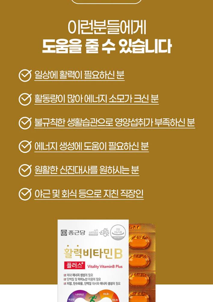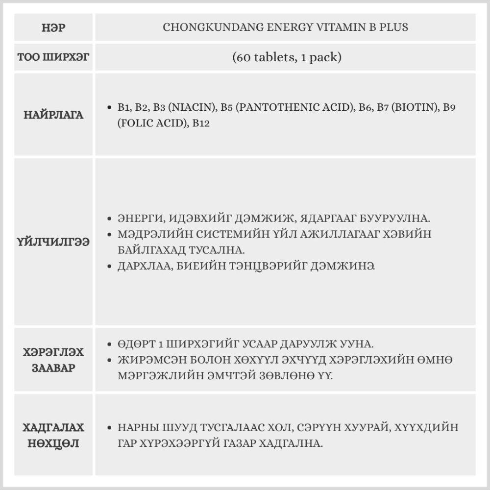 Эрч хүч, энерги, дархлаагаа дэмжих хамгийн энгийн шийдэл! Chongkundang Energy Vitamin B Plus нь завгүй амьдралд ядаргаа багасгах, мэдрэлийн системийг дэмжих B витаминуудын иж бүрэн комплекс бүтээгдэхүүн юм.