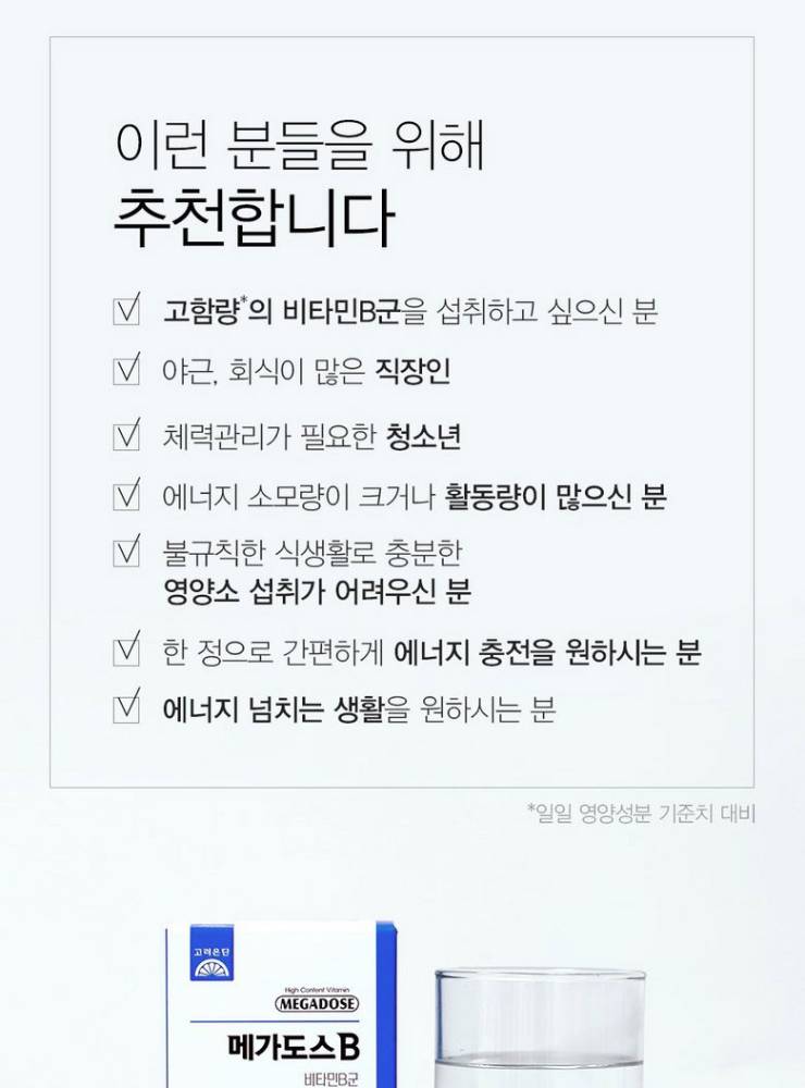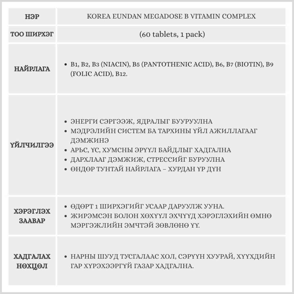 Эрч хүч ба төвлөрлийг сэргээх В витамин! Korea Eundan Megadose B Vitamin Complex нь ядаргаа тайлах, стресс бууруулах, дархлаа болон бодисын солилцоог дэмжих зориулалттай өндөр тунтай В витаминуудын иж бүрдэл юм.