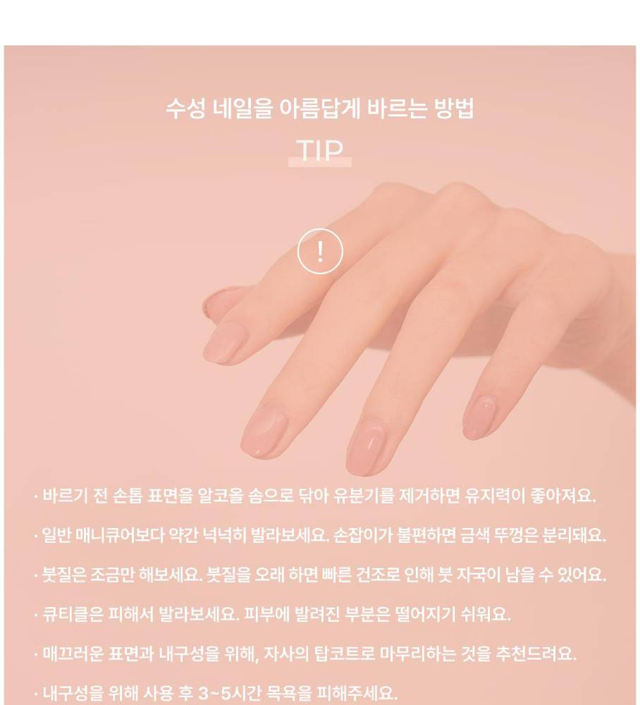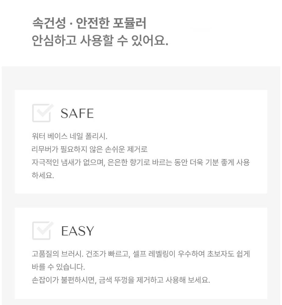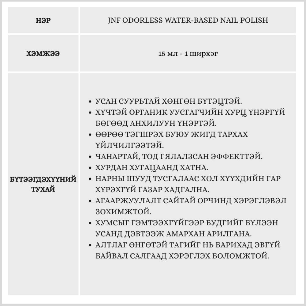 Усан суурьтай арилгахад хялбар хумсны будаг. Бусад хумсны будаг шиг хүчтэй органик уусгагчийн хурц үнэргүй.
