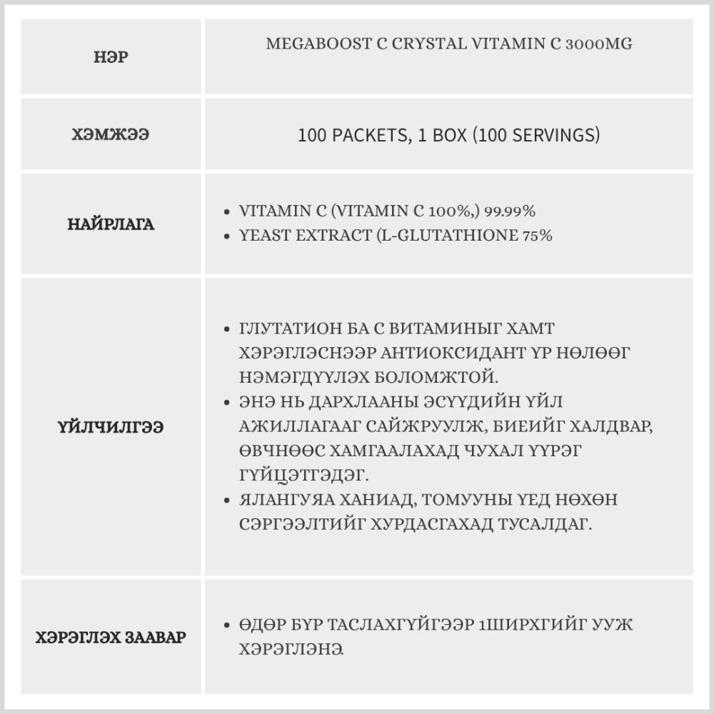 Megaboost C Crystal Vitamin C 3000mg, 100 Packets, 1 Box (100 Servings) /Витамин C/