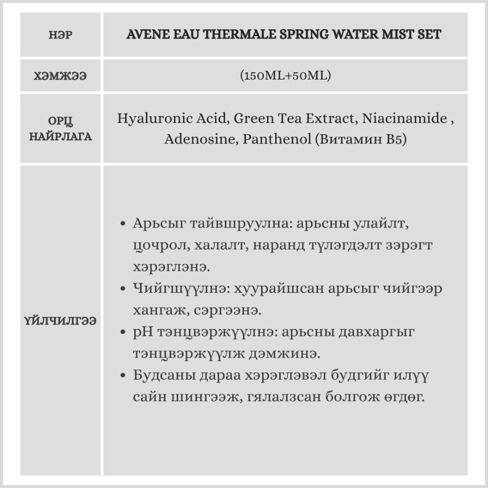 100% Avene мист – ямар нэгэн үнэр оруулагч химийн нэгдэл, хадгалалтын бодис агуулаагүй. Францын эмчилгээний Avene рашаан усан мист нь арьсыг тайвшруулж, чийгшүүлж, хамгаалах зориулалттай 100% байгалийн гаралтай бүтээгдэхүүн юм. Эмзэг, хуурай болон бүх төрлийн арьсанд тохиромжтой.